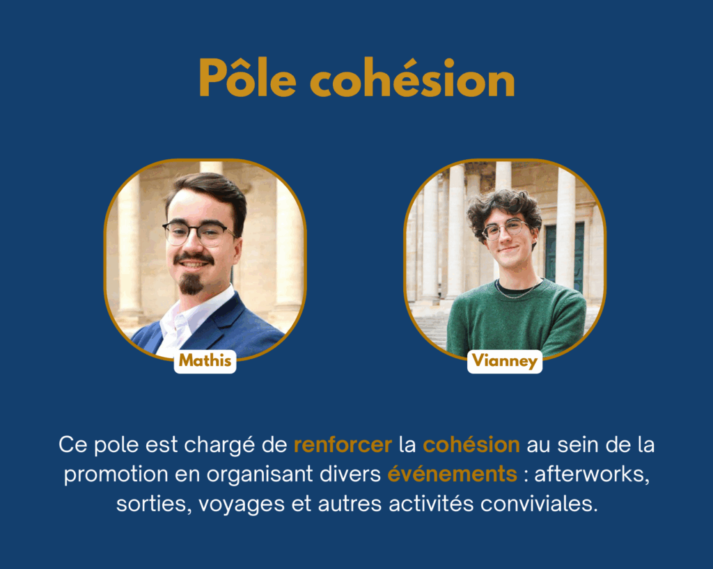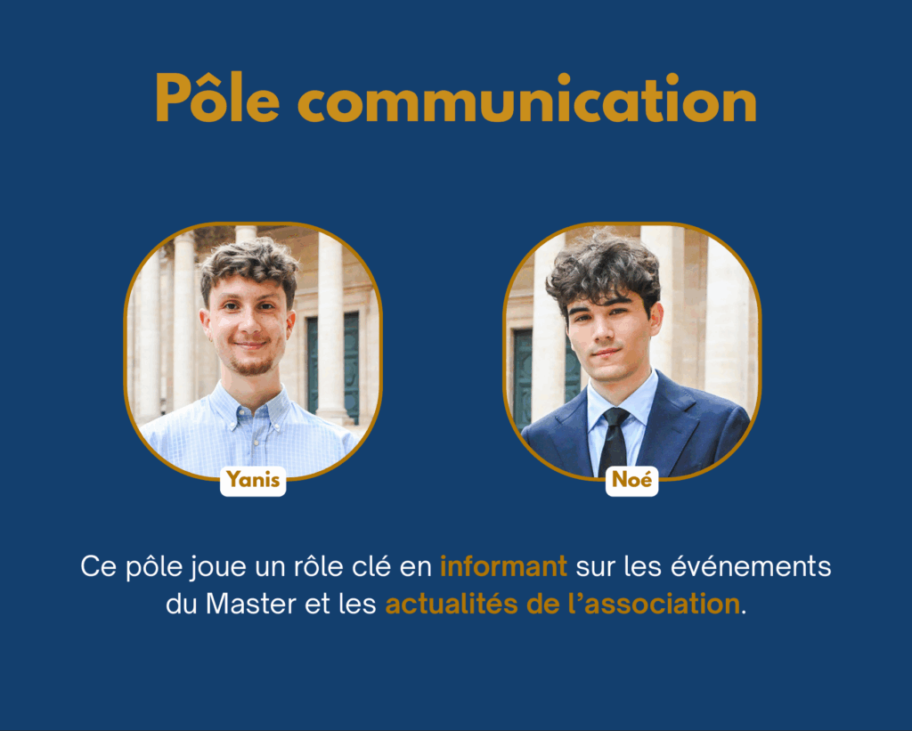 Les membres du bureau sont responsable de la cohésion entre les pôles et d’animer la vie étudiante du master. Ils assurent le lien avec les professeurs, la scolarité de l’université et le parrain ou la marraine de la promotion.